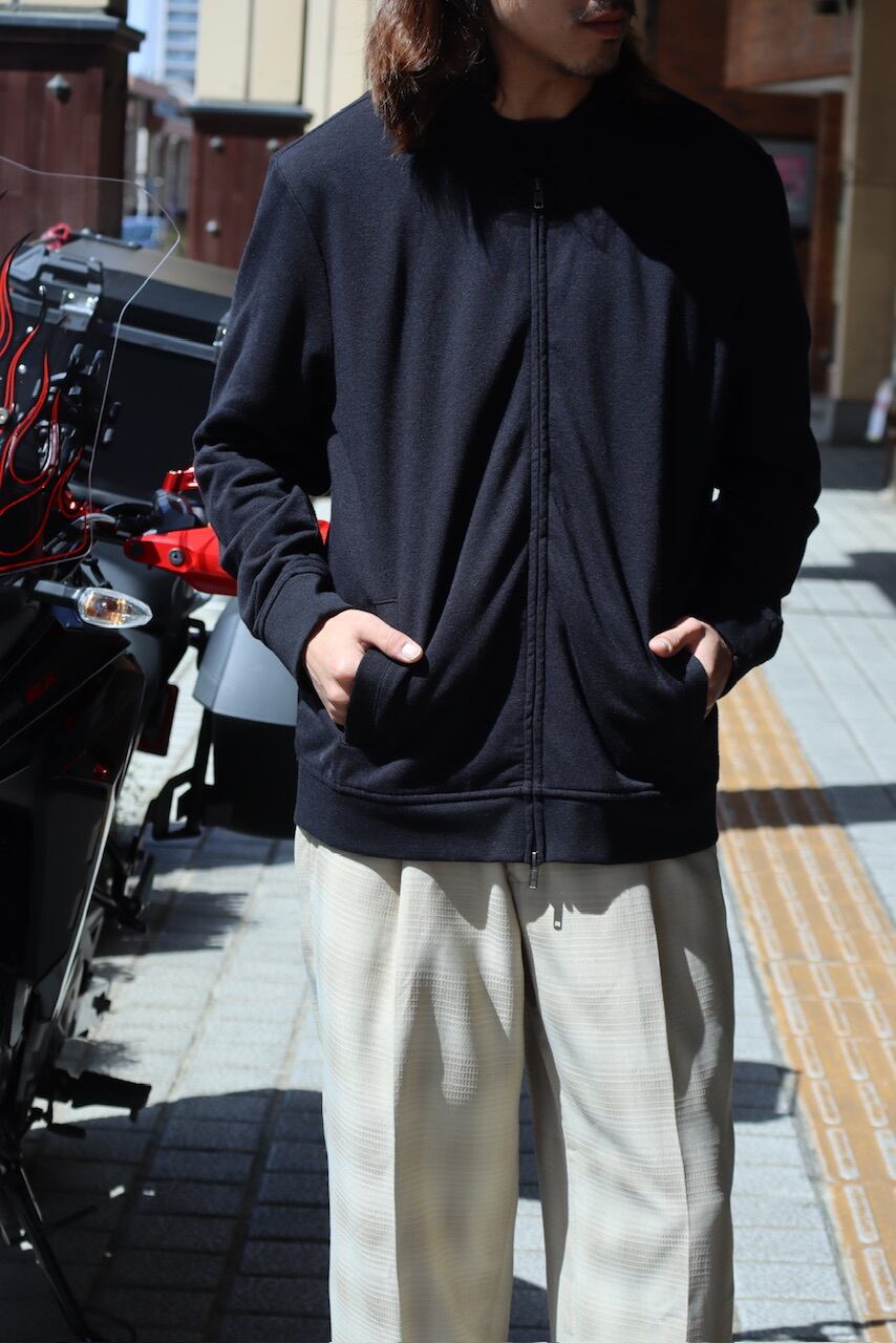 生地のストレッチが効いた薄手のフルジップスウェットカーデ