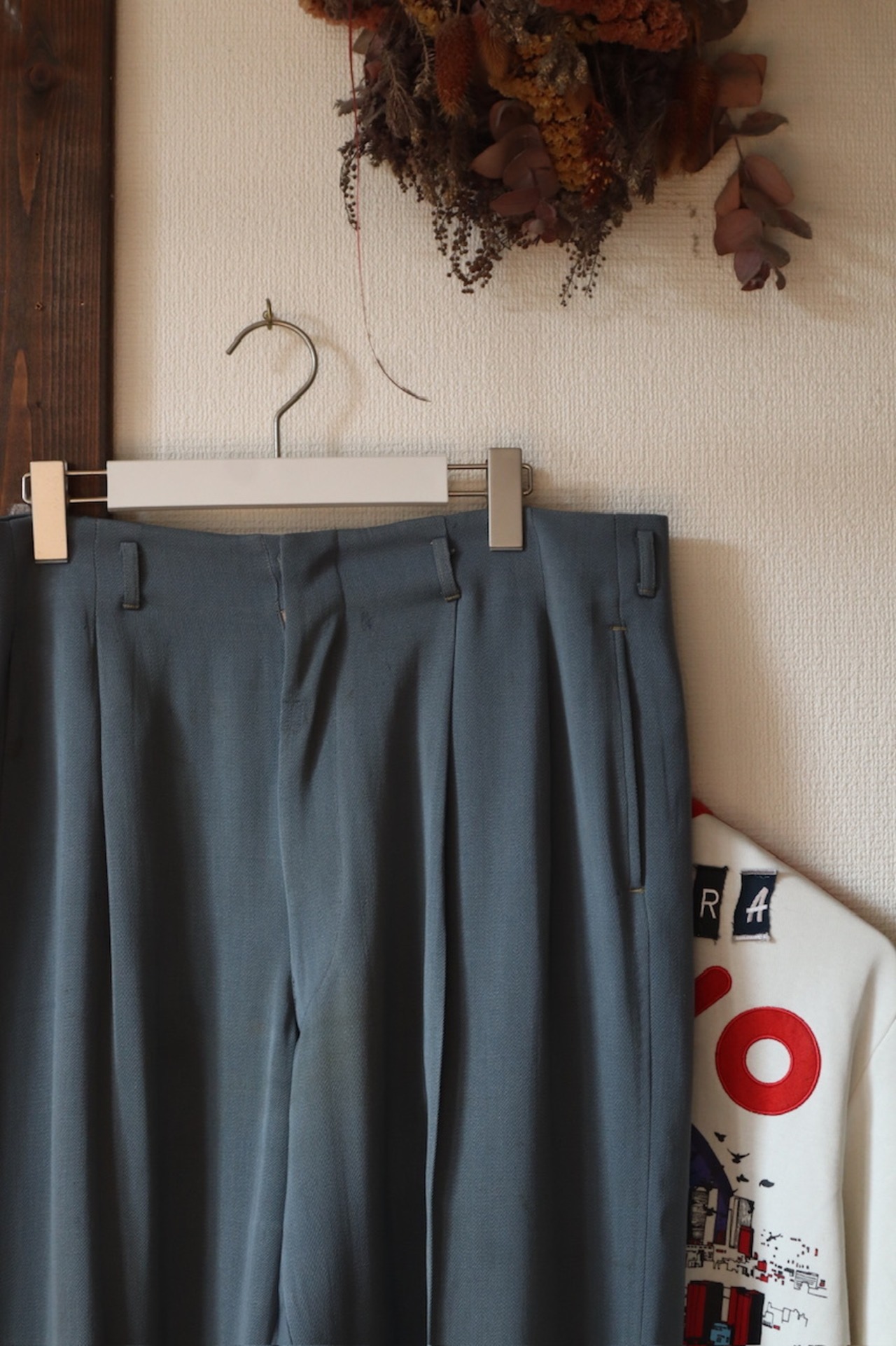 古いスラックス特有のテーパードの効かないワイドストレートに深めの股上が演出する玄人感
