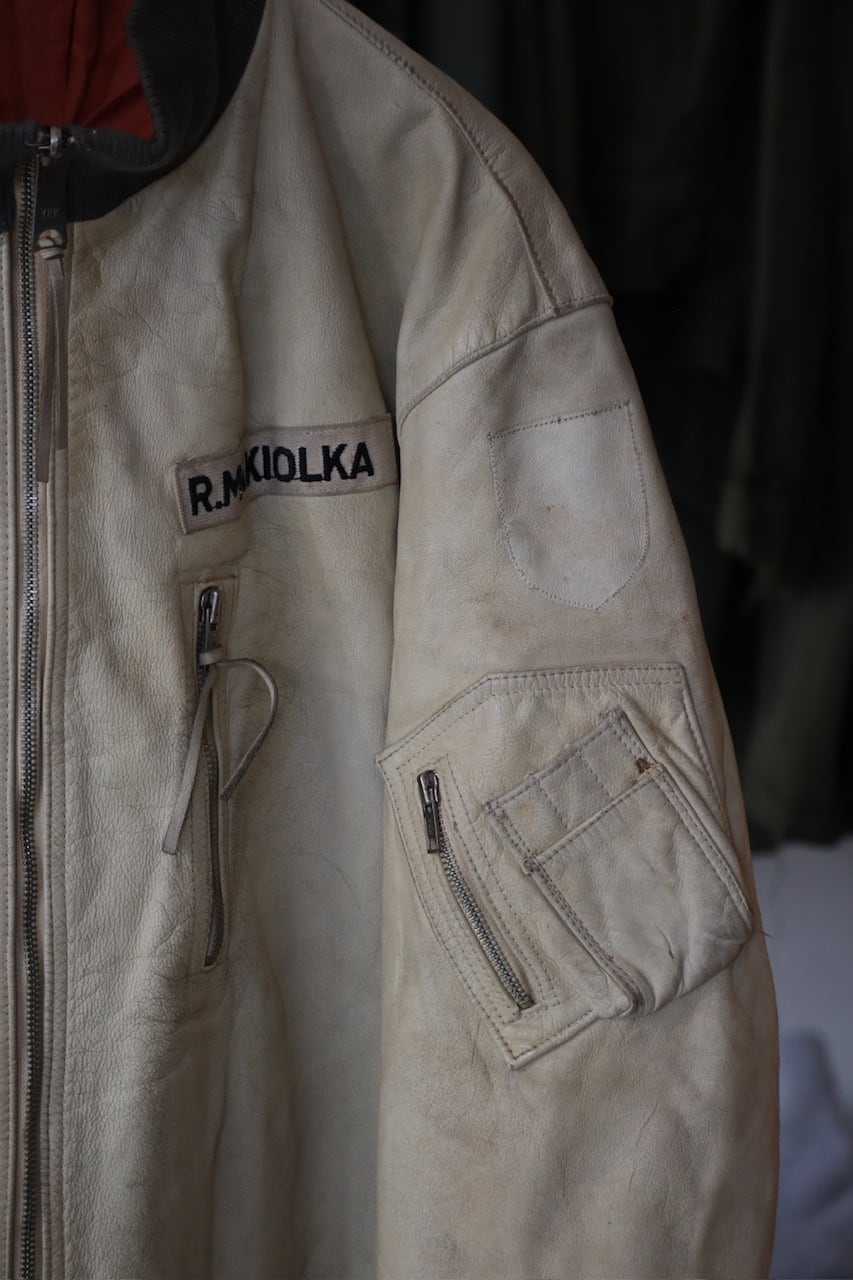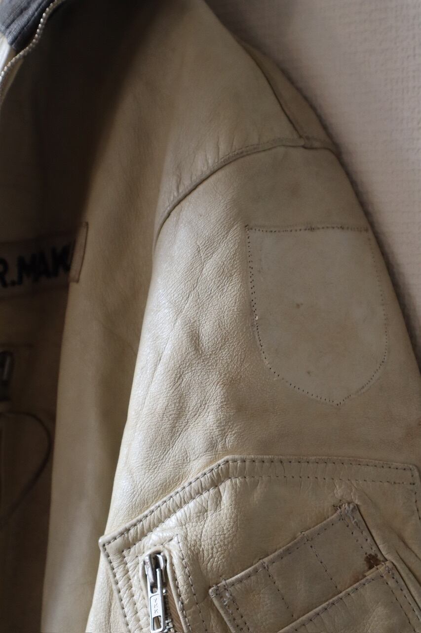 ミリタリーな上にレザーなだけあって野暮ったい印象が強いですがボディのカラー、ディテールと相まってスッキリと着れる1着